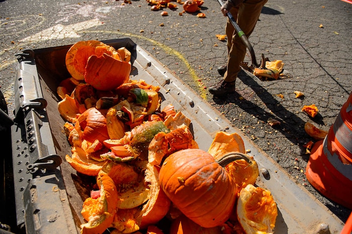 Destroyed pumpkins at Glover Nursery in West Jordan on Saturday Nov. 3, 2018. The nursery held its annual pumpkin smash and food drive, dropping pumpkins from a cherry picker and collecting donations for the needy.