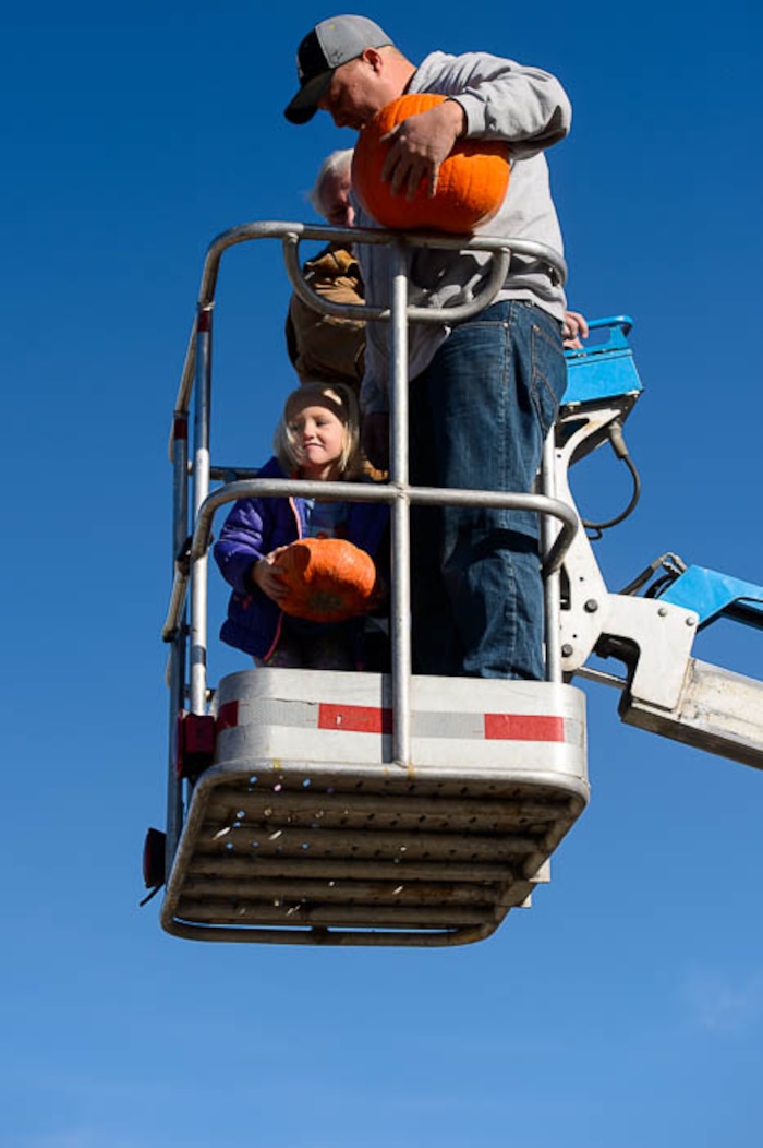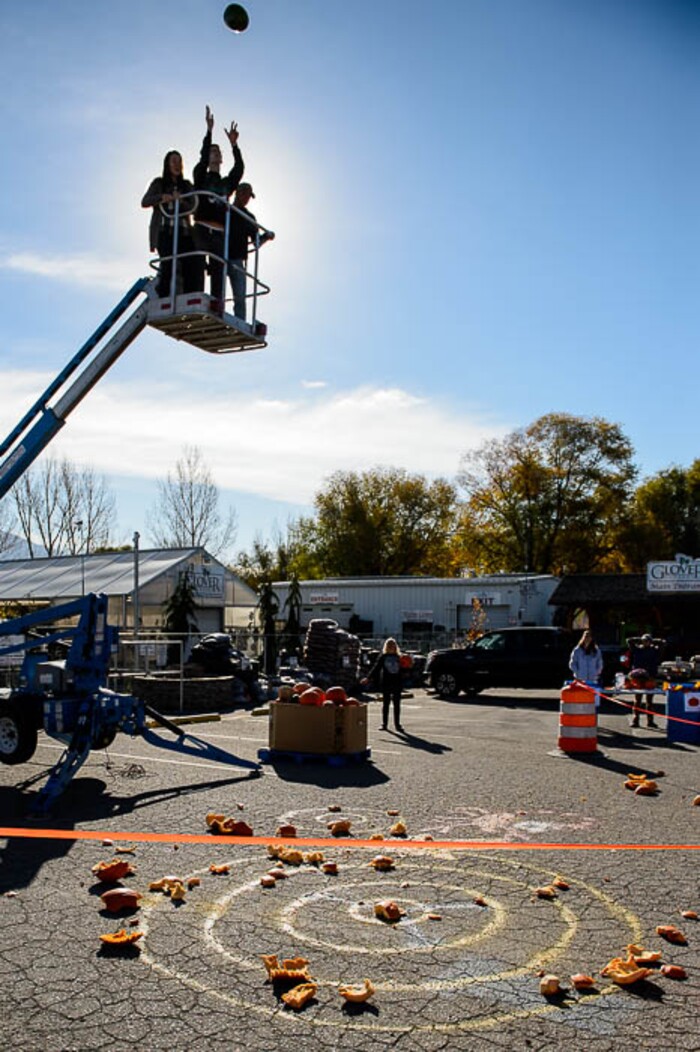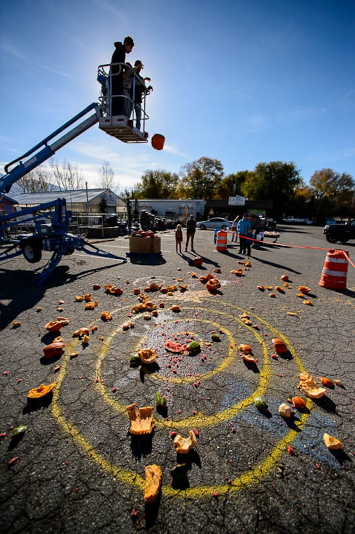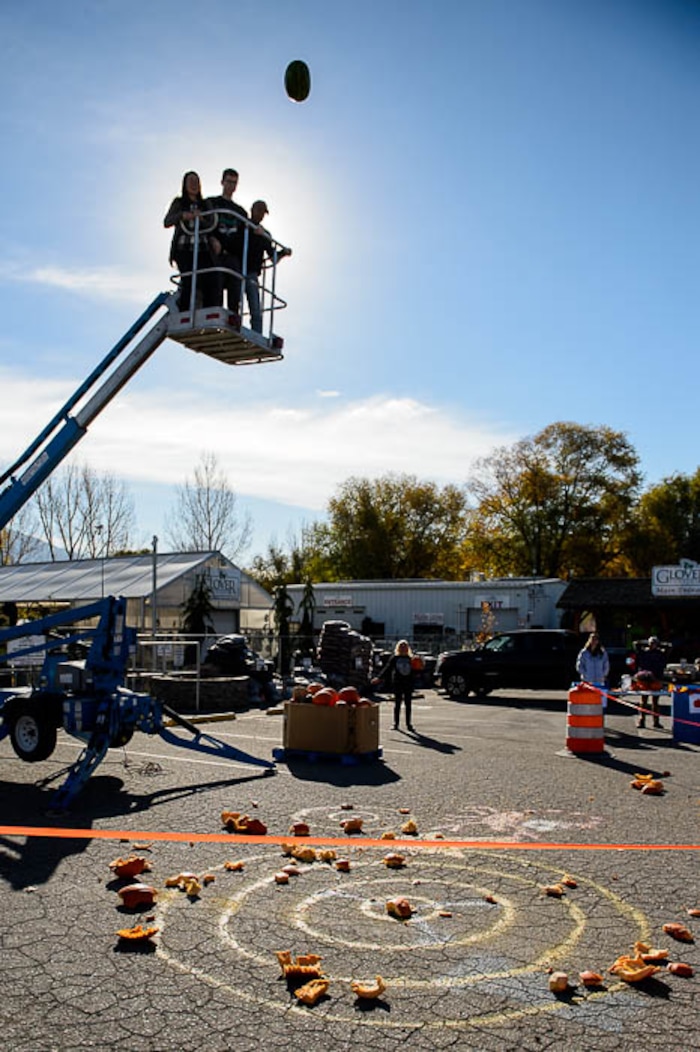 Justin Fisher launches a pumpkin into the air at Glover Nursery in West Jordan on Saturday Nov. 3, 2018. The nursery held its annual pumpkin smash and food drive, dropping pumpkins from a cherry picker and collecting donations for the needy.