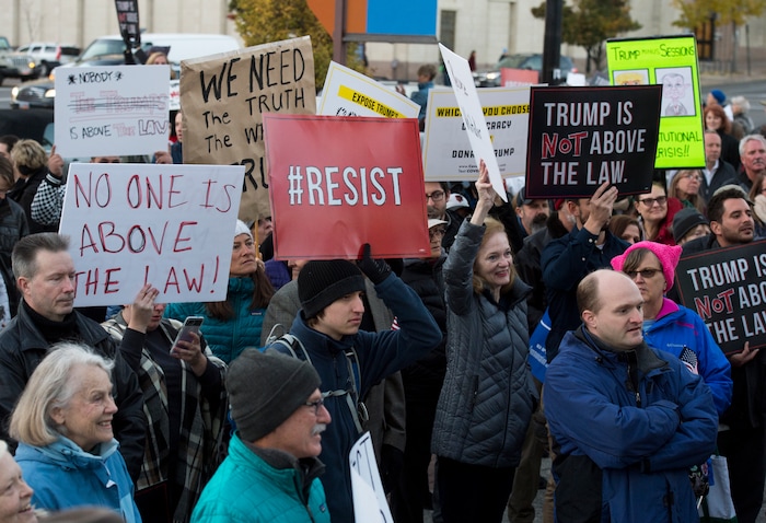 The correction underscored why Schultz and the other organizers of the bipartisan group Salt Lake Indivisible had called the Thursday afternoon protest. Group members and many who showed up wanted to send a message to President Donald Trump in the wake of his firing of ex-Attorney General Jeff Sessions and the appointment of Matthew Whitaker, a critic of the FBI probe into possible collusion between the president’s campaign and Russia in the 2016 election, as the acting attorney general.