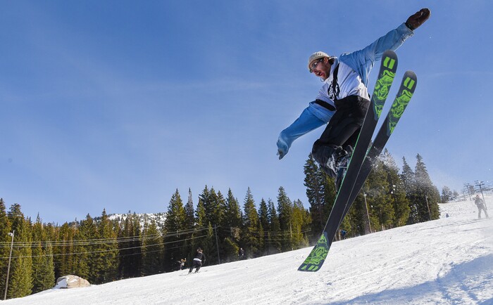 (Francisco Kjolseth | The Salt Lake Tribune) A skier kicks up his tips as Brighton Resort opens for the season, Thursday, Nov. 15, 2018, with Majestic and Explorer lifts open.
