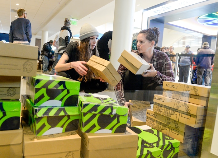 Leah Hogsten | The Salt Lake Tribune l-r Kuru footwear employees Kasey Murphy and Ashley Owen hand out new shoes to homeless and low-income families at the Utah Jazz and the Larry H. Miller Group sponsored annual “We Care – We Share” Thanksgiving Meal and benefit, Monday, Nov 19, 2018.