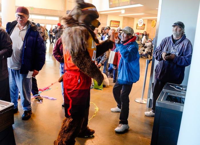 Leah Hogsten | The Salt Lake Tribune Valentin Guzman shares a laugh with Jazz Bear at the Utah Jazz and the Larry H. Miller Group sponsored annual “We Care – We Share” Thanksgiving Meal for local homeless and low-income families, Monday, Nov 19, 2018.