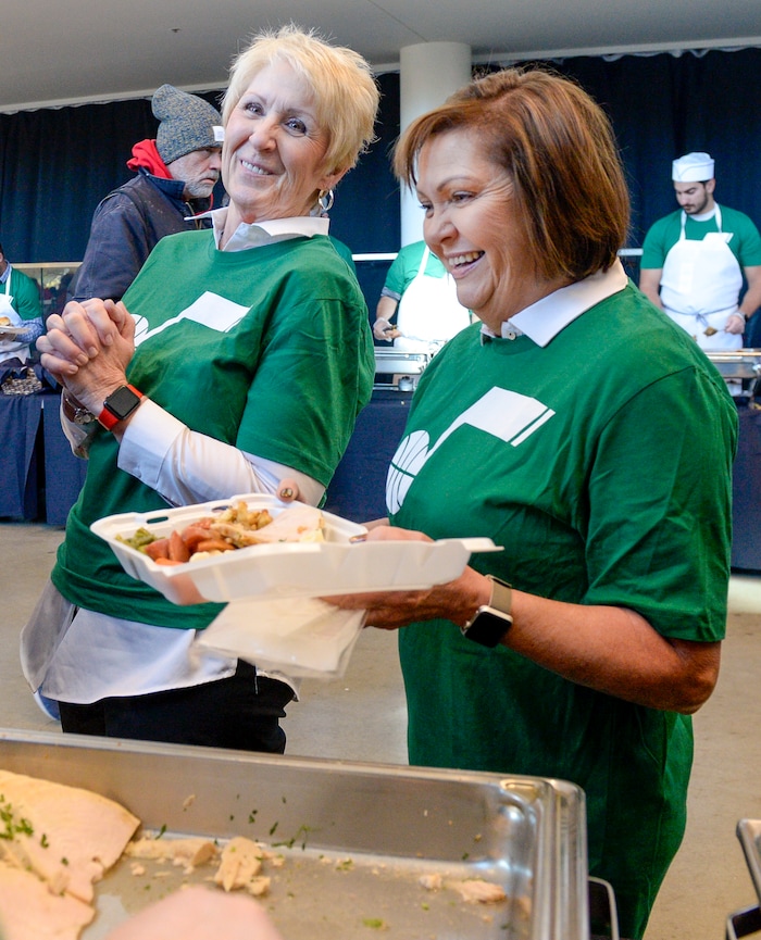 Leah Hogsten | The Salt Lake Tribune l-r Kathy Farrow and Julene Jolley share a laugh with Jared Covington while filling a container with food for a woman who needed help at the Utah Jazz and the Larry H. Miller Group sponsored annual “We Care – We Share” Thanksgiving Meal for local homeless and low-income families, Monday, Nov 19, 2018.