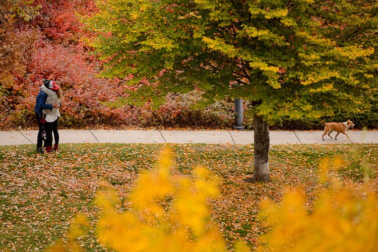 A couple embrace during a dog walk in Salt Lake City’s Memory Grove on Nov. 1.