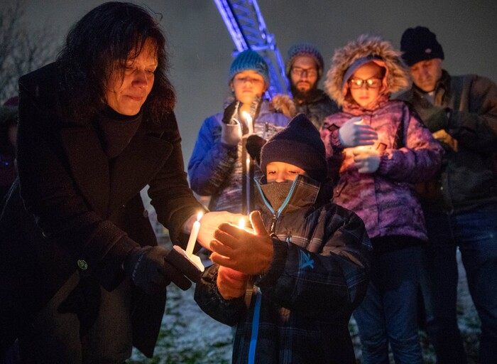 (Keith Johnson | Special to The Tribune) Tiffany VanZeben lights the candle of her grandson Emery Romrell (6) during a candlelight vigil Dec. 2, 2018, at the Columbus Community Center in South Salt Lake for Officer David Romrell, a South Salt Lake police officer killed in the line of duty Nov. 24, when he was struck by a car driven by a fleeing suspect. Several hundred members of the community attended the vigil including family, friends, South Salt Lake Mayor Cherie Wood and representatives from the Utah Highway Patrol, Unified Police and Unified Fire.