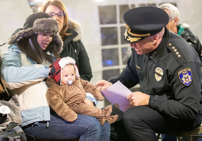 (Keith Johnson | Special to The Tribune) South Salt Lake Police Chief Jack Carruth talks to Liz Romrell and her son Jackson (4 months) before a candlelight vigil Dec. 2, 2018, at the Columbus Community Center in South Salt Lake for Liz's husband, fallen Officer David Romrell, a South Salt Lake police officer killed in the line of duty Nov. 24, when he was struck by a car driven by a fleeing suspect. Several hundred members of the community attended the vigil including family, friends, South Salt Lake Mayor Cherie Wood and representatives from the Utah Highway Patrol, Unified Police and Unified Fire.