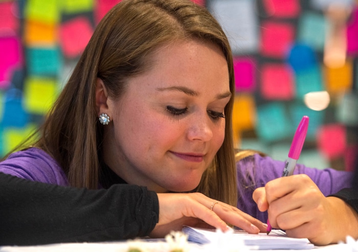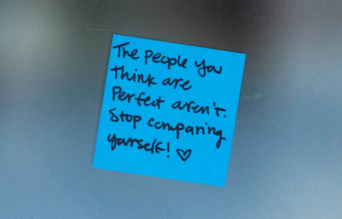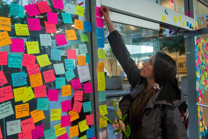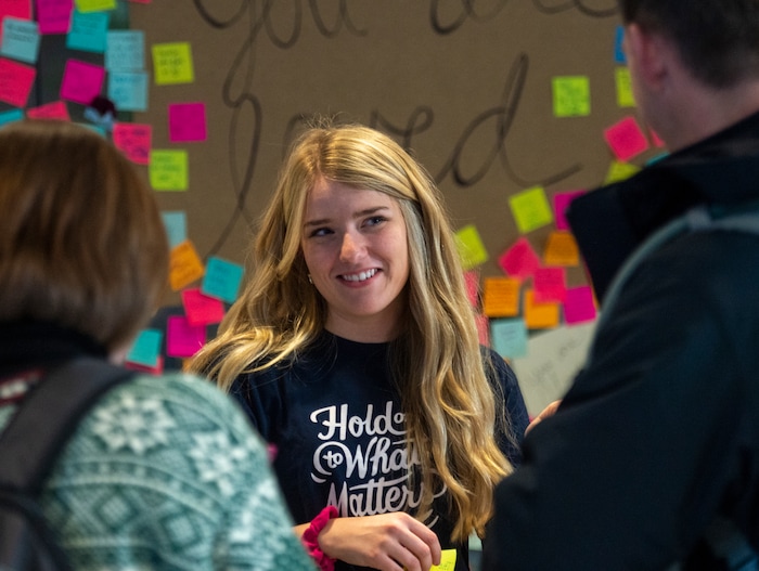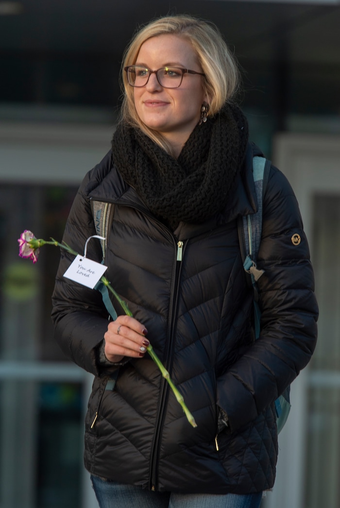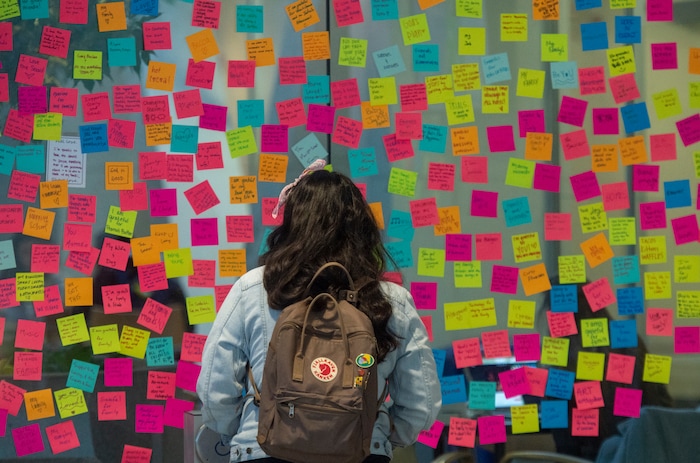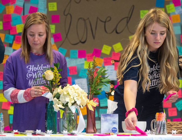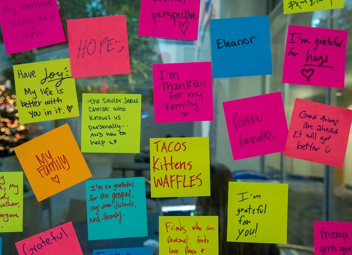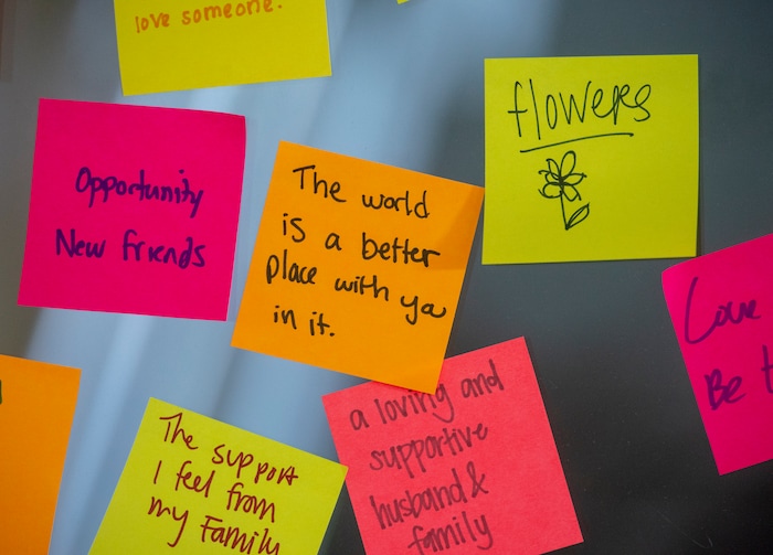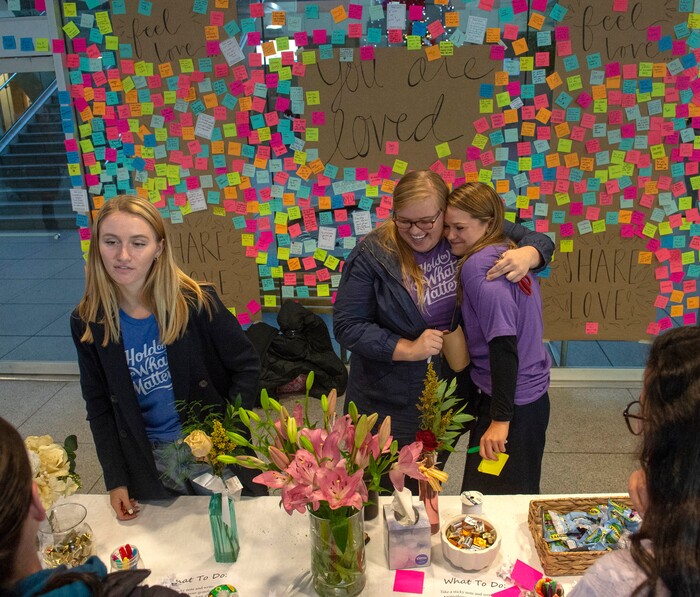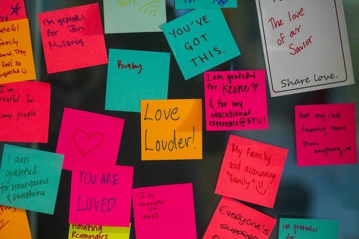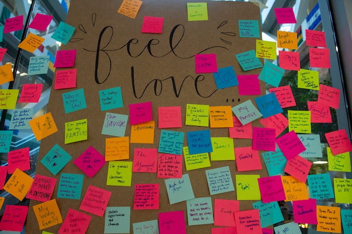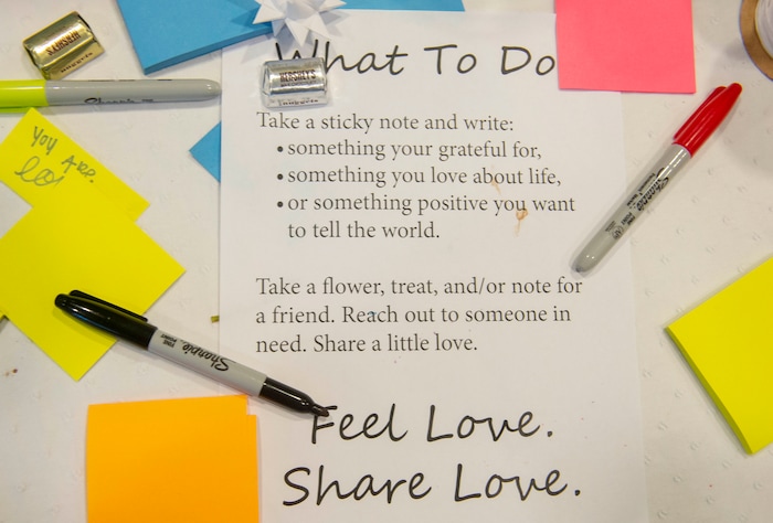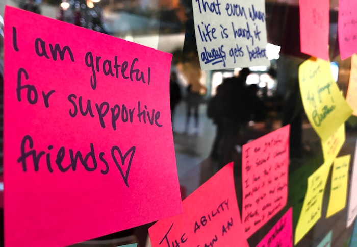 To help, student Sabrina Christensen and two of her friends created a memorial desk in the atrium of the building when it reopened in the morning. Students could grab a free rose or carnation with an attached note that said, “You are loved.” They also filled out colorful sticky notes, listing things they are grateful for, and stuck them around the room.