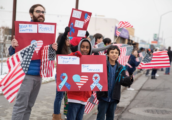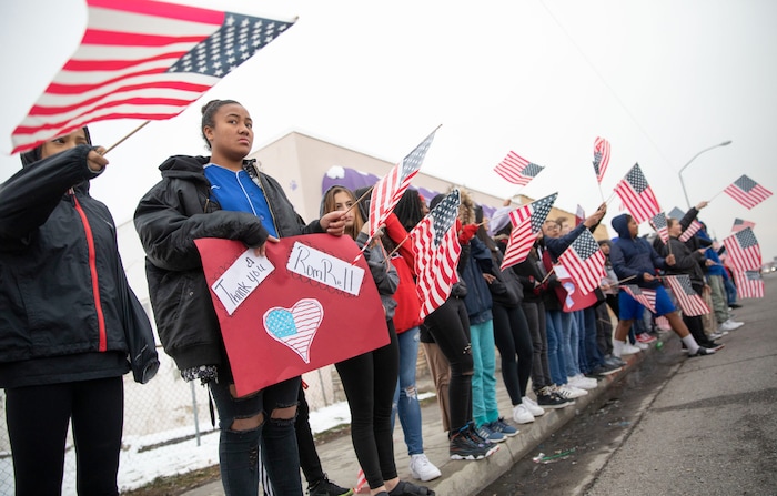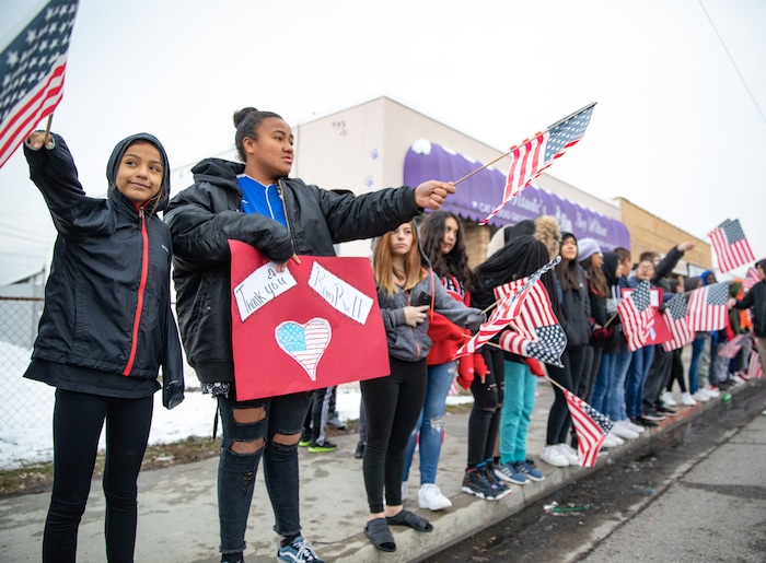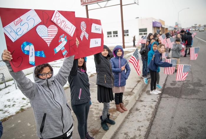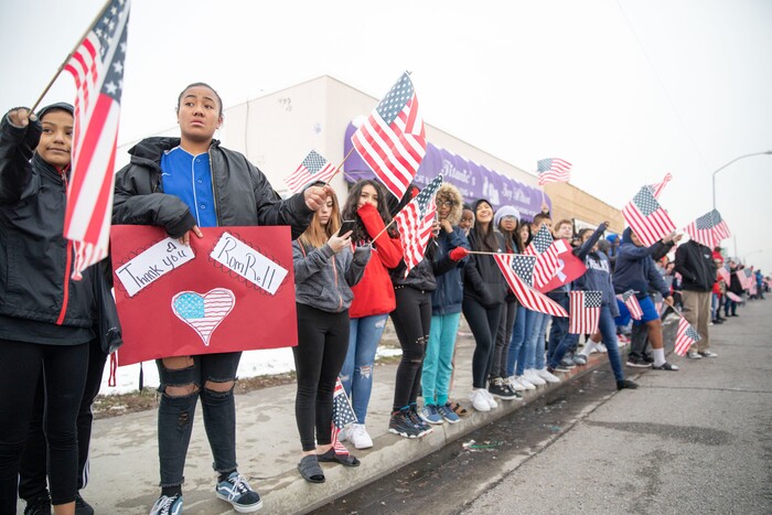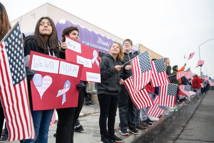 (Keith Johnson | special to The Salt Lake Tribune) Students and staff from Granite Park Jr. High line State Street near 3000 South to watch the funeral procession for Officer David Romrell Dec. 5, 2018 in South Salt Lake, Utah. Officer Romrell, a South Salt Lake police officer, was killed in the line of duty Nov. 24th when he was struck by a car driven by a fleeing suspect.