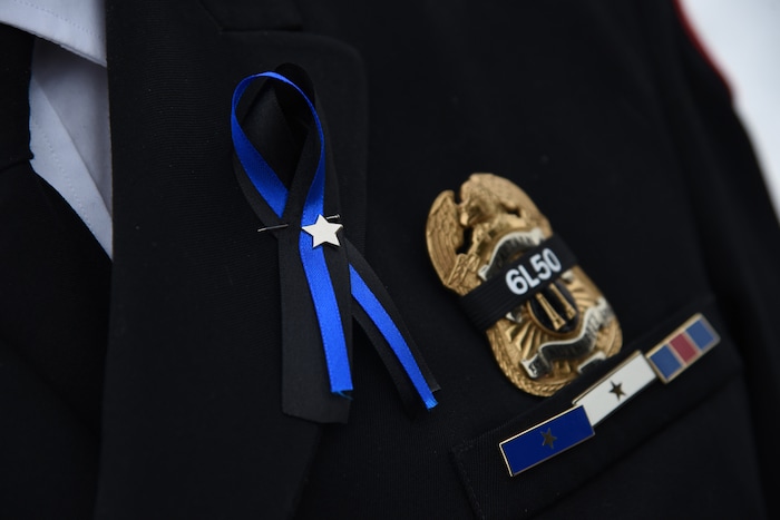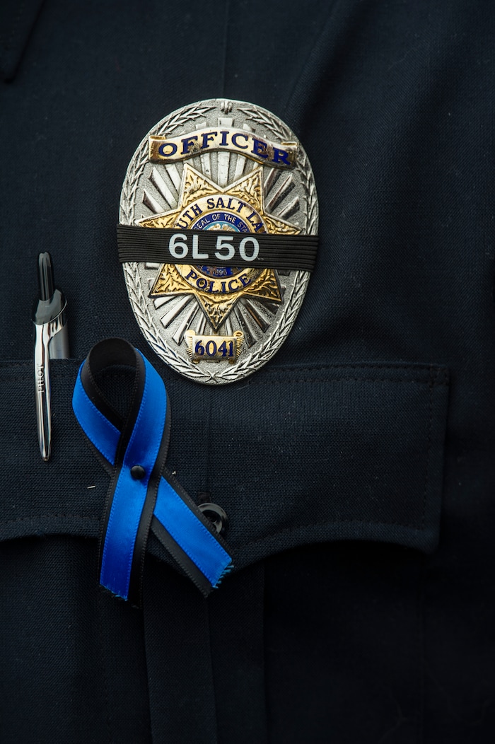 South Salt Lake Police officers were black band over their badges, during the funeral for South Salt Lake police officer, David Romrell, at the Maverik Center, in West Valley City, Wednesday, Dec. 5, 2018.