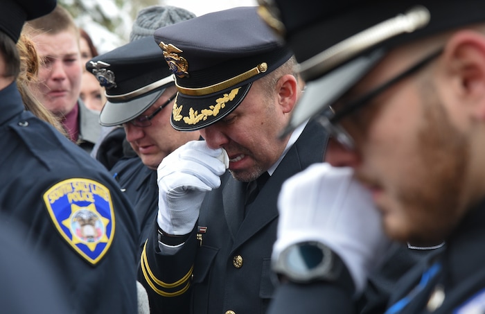 (Rick Egan | The Salt Lake Tribune) Mayor Cherie Wood conducts the funeral for South Salt Lake police officer, David Romrell, who died after being struck by a car during a clash with two burglary suspects on Nov. 24. Wednesday, Dec. 5, 2018.