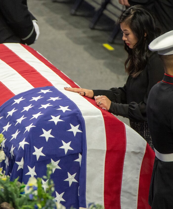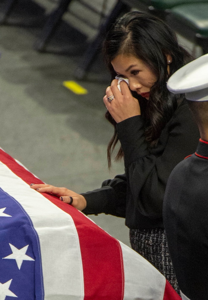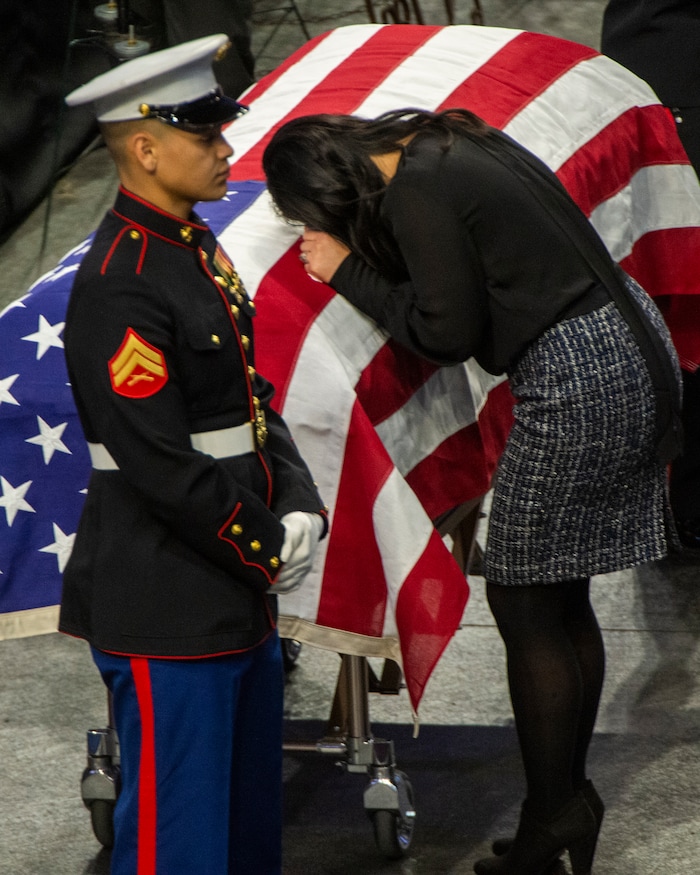 (Rick Egan | The Salt Lake Tribune) Elizabeth Romrell spends a moment by the casket of her husband, South Salt Lake police officer, David Romrell, before his funeral at the Maverik Center, in West Valley City, Wednesday, Dec. 5, 2018.