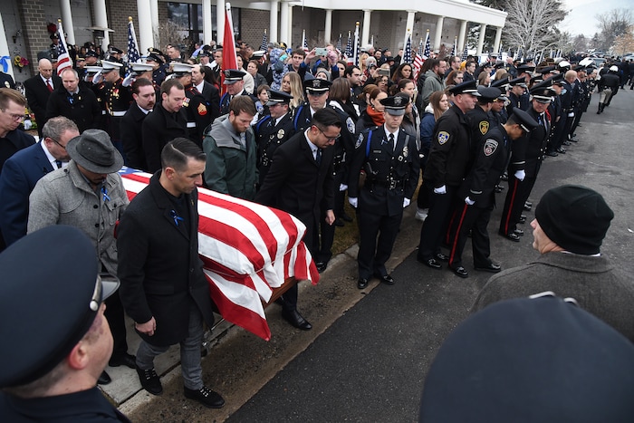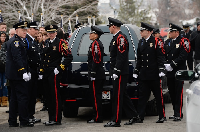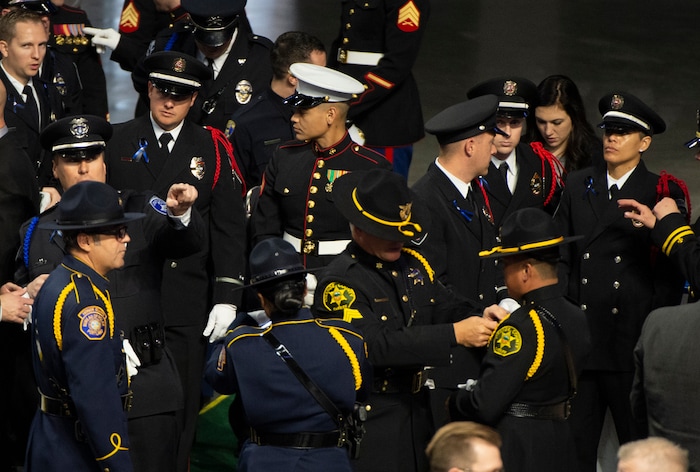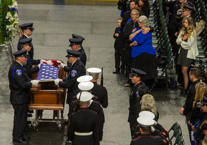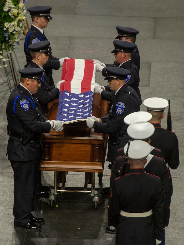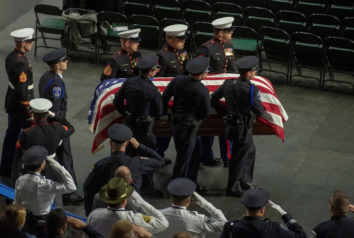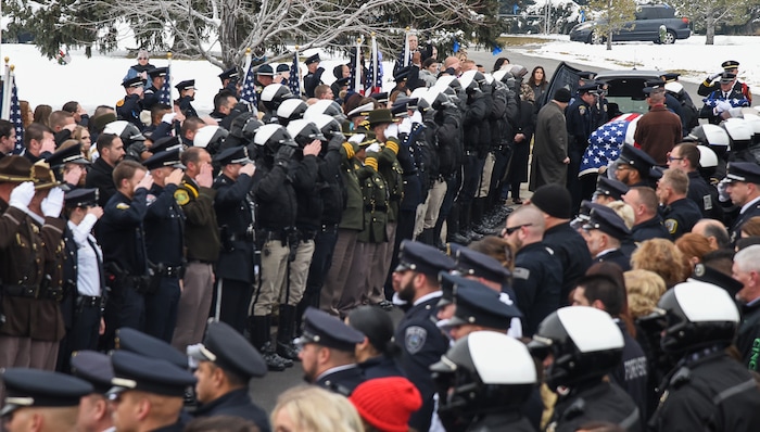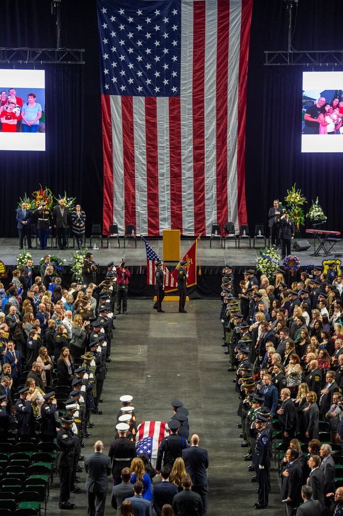 Toward the end of the service, before the casket was carried out of the stadium, South Salt Lake Mayor Cherie Wood took the microphone to list the phrases those in and around law enforcement use to describe the inherent unpredictability of the job and the community it fosters, which she called the noble statements of a noble profession: “Brothers and sisters in blue. Thin blue line. Never be forgotten.”