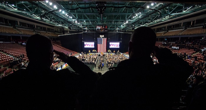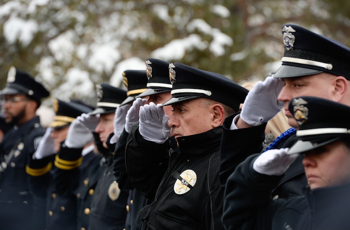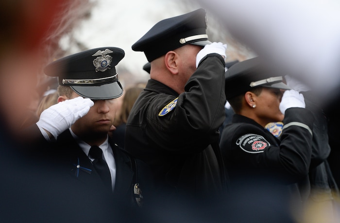 (Rick Egan | The Salt Lake Tribune) Pall Police officers salute, during the funeral for South Salt Lake police officer, David Romrell, at the Maverik Center in West Valley City, Wednesday, Dec. 5, 2018.