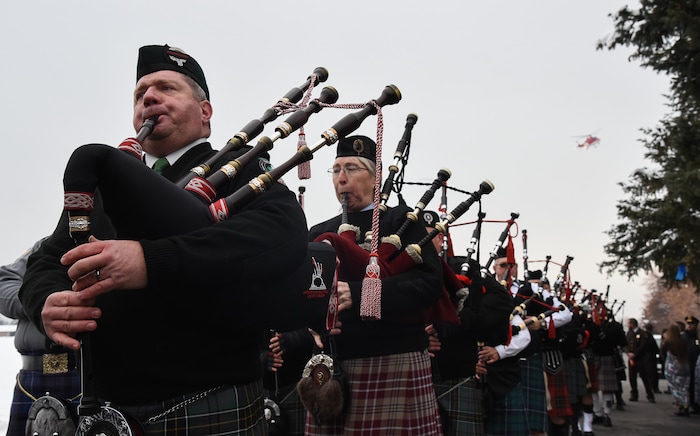 (Francisco Kjolseth | The Salt Lake Tribune) The bagpipes play during a helicopter fly over in honor of police officer David Romrell during funeral services at Larkin Sunset Gardens Cemetery in Sandy, Wed. Dec. 5, 2018.