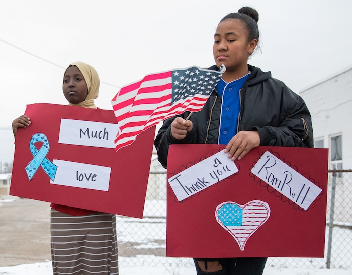 (Keith Johnson | special to The Salt Lake Tribune) Granite Park Junior High eighth graders Monalani Siliga (right) and Munila Abdullahi join nearly 500 of their classmates and staff as they line State Street near 3000 South to show their support and watch the funeral procession for Officer David Romrell Dec. 5, 2018 in South Salt Lake, Utah. Officer Romrell, a South Salt Lake police officer, was killed in the line of duty Nov. 24th when he was struck by a car driven by a fleeing suspect.