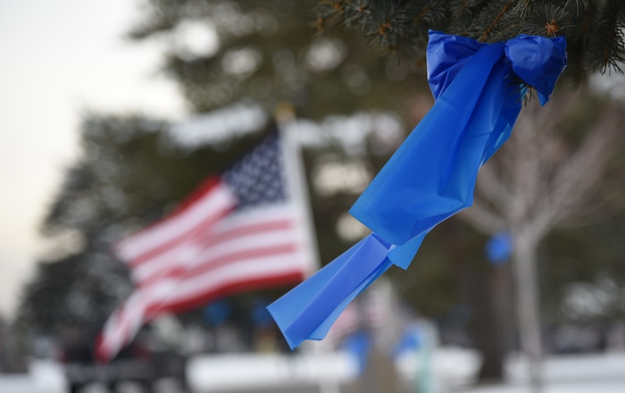 (Francisco Kjolseth | The Salt Lake Tribune) Blue ribbons line the trees in anticipation of police officer David Romrell's funeral services at Larkin Sunset Gardens Cemetery in Sandy, Wed. Dec. 5, 2018.