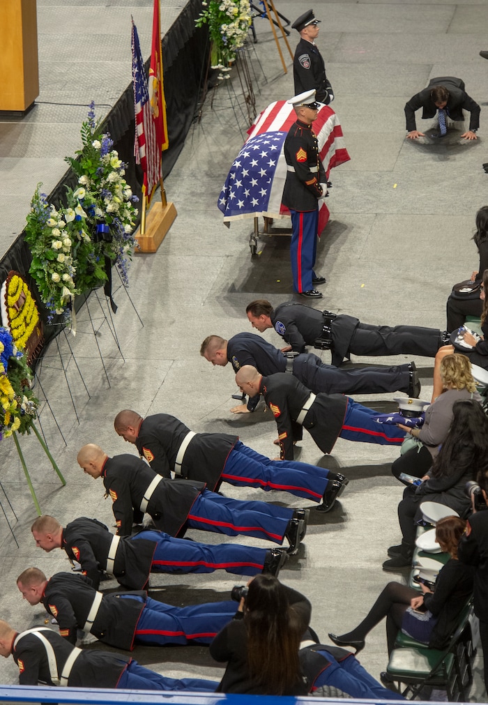 (Rick Egan | The Salt Lake Tribune) Members of the United States Marine Corps do push-ups, during the funeral for South Salt Lake police officer David Romrell, at the Maverik Center in West Valley City, Wednesday, Dec. 5, 2018.