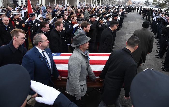 (Francisco Kjolseth | The Salt Lake Tribune) Friends of police officer David Romrell carry his casket away for planned cremation following funeral services at Larkin Sunset Gardens Cemetery in Sandy, Wed. Dec. 5, 2018.