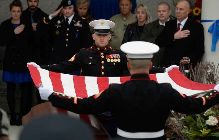 (Francisco Kjolseth | The Salt Lake Tribune) Members of the Marine Corps fold the flag draping the casket of police officer David Romrell during funeral services at Larkin Sunset Gardens Cemetery in Sandy, Wed. Dec. 5, 2018.