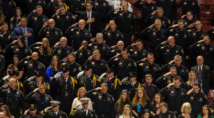 (Rick Egan | The Salt Lake Tribune) Police officers from around the State of Utah gather for the funeral for South Salt Lake police officer, David Romrell, at the Maverik Center, in West Valley City, Wednesday, Dec. 5, 2018.