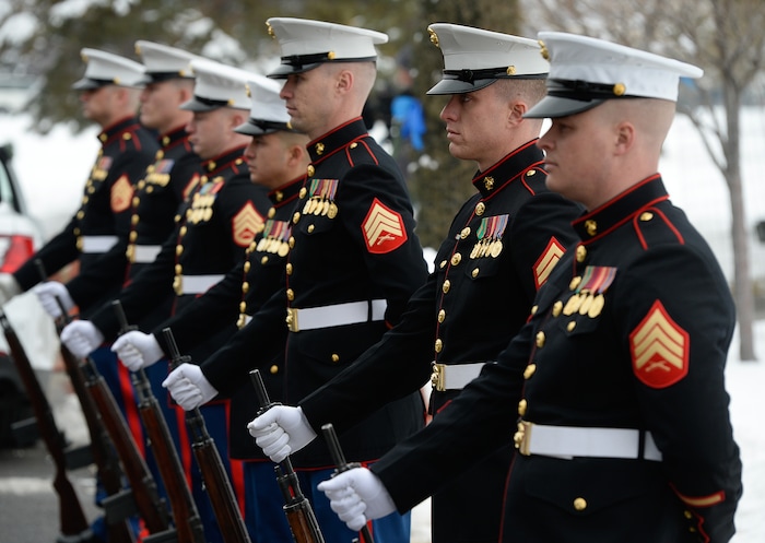 (Francisco Kjolseth | The Salt Lake Tribune) Members of the Marine Corps attend police officer David Romrell's funeral services at Larkin Sunset Gardens Cemetery in Sandy, Wed. Dec. 5, 2018.
