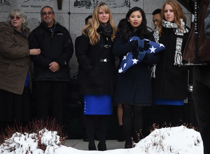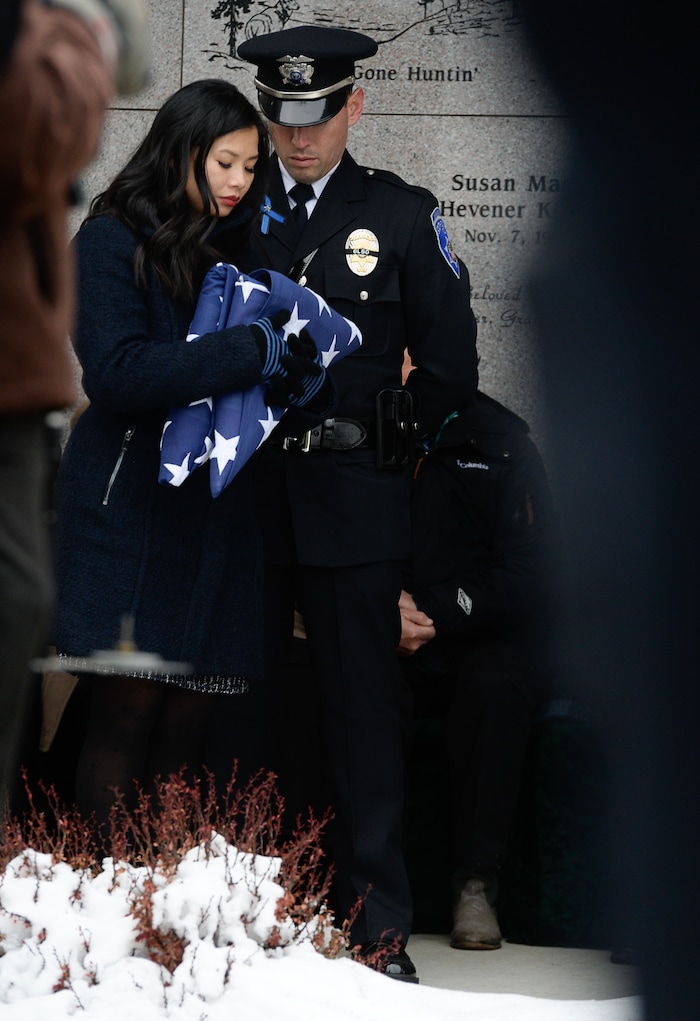 (Francisco Kjolseth | The Salt Lake Tribune) Elizabeth Romrell, wife of police officer David Romrell is presented his folded flag by South Salt Lake Police Chief Jack Caruth during funeral services at Larkin Sunset Gardens Cemetery in Sandy, Wed. Dec. 5, 2018.