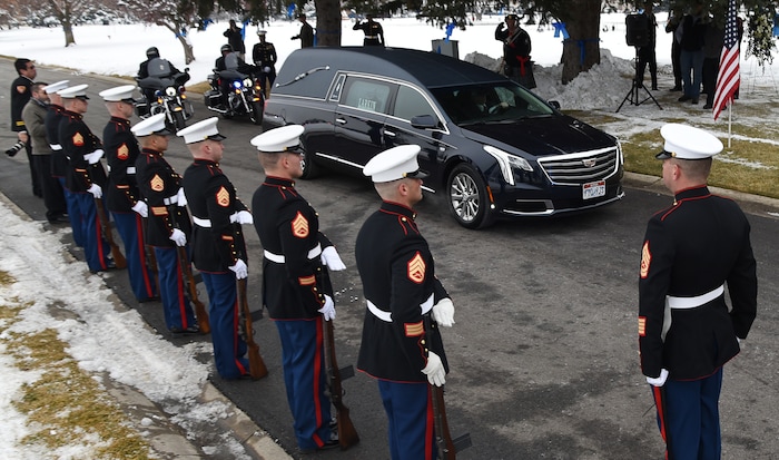 (Francisco Kjolseth | The Salt Lake Tribune) The hearse carrying police officer David Romrell arrives as the Marine Corps stand at attention during funeral services at Larkin Sunset Gardens Cemetery in Sandy, Wed. Dec. 5, 2018.