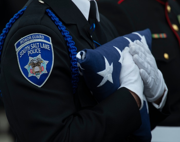 (Rick Egan | The Salt Lake Tribune) Pall A member of the South Salt Lake Police Honor Guard holds the American flag, during the funeral for South Salt Lake police officer, David Romrell, at the Maverik Center in West Valley City, Wednesday, Dec. 5, 2018.