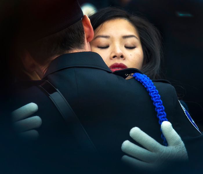(Rick Egan | The Salt Lake Tribune) Elizabeth Romrell, wife of South Salt Lake police officer, David Romrell gets a hug, before the funeral at the Maverik Center, in West Valley City, Wednesday, Dec. 5, 2018.