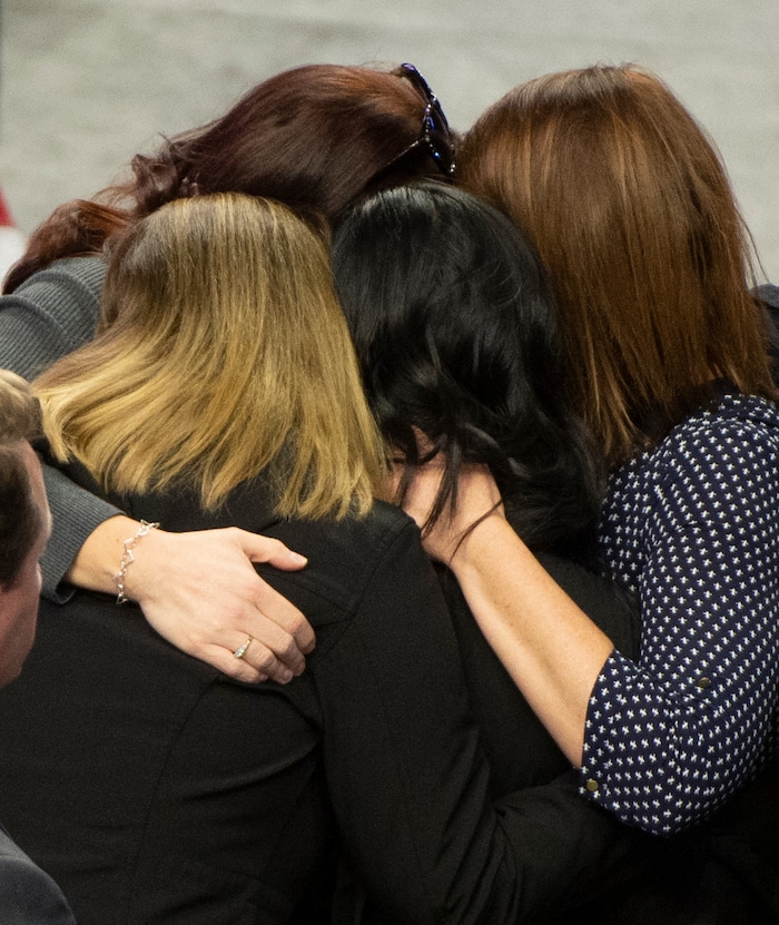 (Rick Egan | The Salt Lake Tribune) Elizabeth Romrell, wife of South Salt Lake police officer, David Romrell is hugged by her loved ones, before the funeral at the Maverik Center, in West Valley City, Wednesday, Dec. 5, 2018.