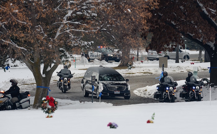 (Francisco Kjolseth | The Salt Lake Tribune) The hearse carrying police officer David Romrell arrives for funeral services at Larkin Sunset Gardens Cemetery in Sandy, Wed. Dec. 5, 2018.