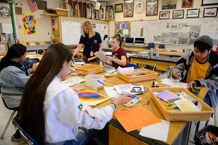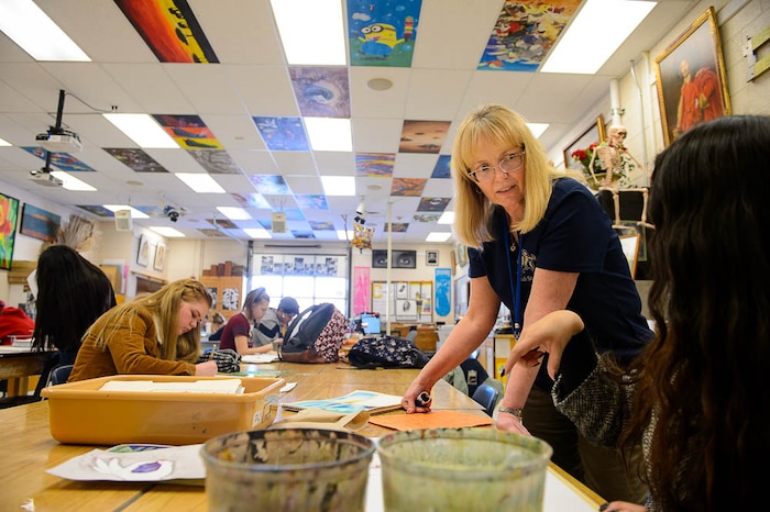Art teacher Cindy McKay works with students at Cyprus High School in Magna on Thursday Jan. 3, 2019.