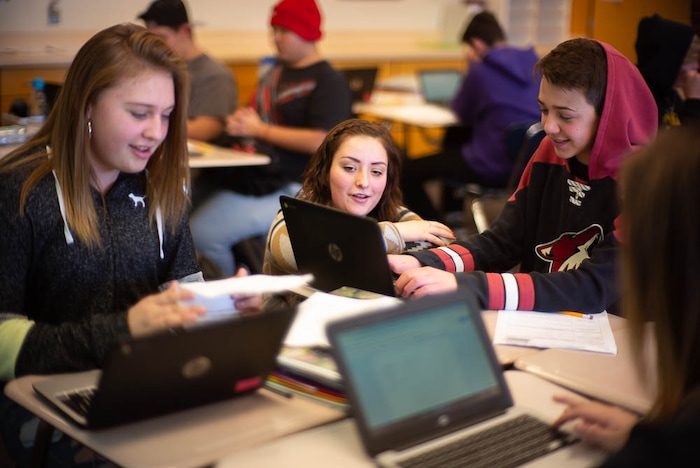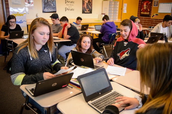 Teacher Ashley Snarr, center, works with students in her English 9 class at Cyprus High School in Magna on Thursday Jan. 3, 2019.
