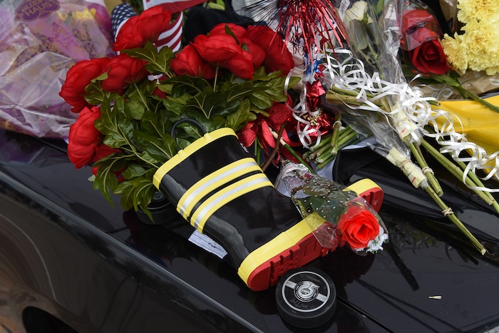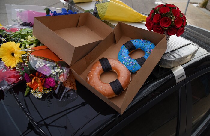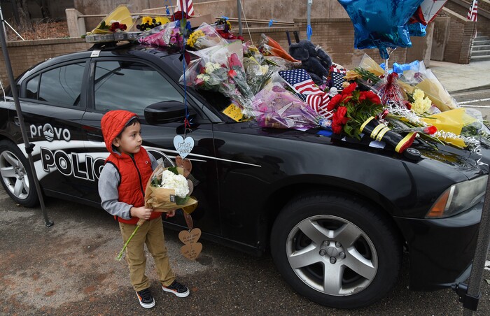 Provo • Squad car No. 374 was barely recognizable under the yellow carnations piled so high that they covered the police siren lights on top. Gold badges, American flags and hockey pucks blanketed the vehicle’s hood. And someone left a box of doughnuts — glazed and coated in sprinkles — above the driver side door.