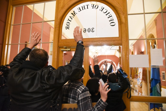 Shouts reverberated off the walls inside the Salt Lake City and County building Thursday as a group of a dozen protesters marched to Mayor Jackie Biskupski’s office on the third floor.