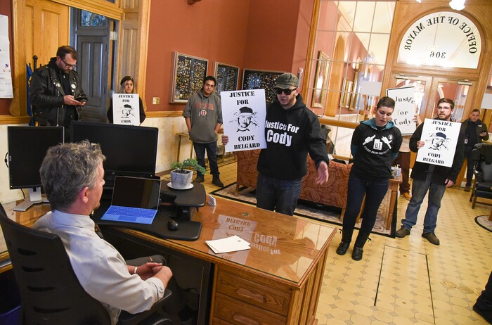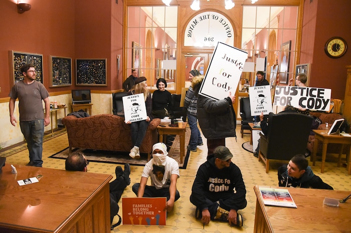 (Francisco Kjolseth | The Salt Lake Tribune) Utah Against Police Brutality and members of Cody BelgardÕs family, the popular Glendale rapper, who was shot by police last November, hold a sit-in at the office of Mayor Jackie Biskupski in an effort to try to get a meeting schedule with the mayor. For weeks, the family of Cody Belgard has asked to meet with Mayor Biskupski to discuss his shooting by SLCPD, to no avail.