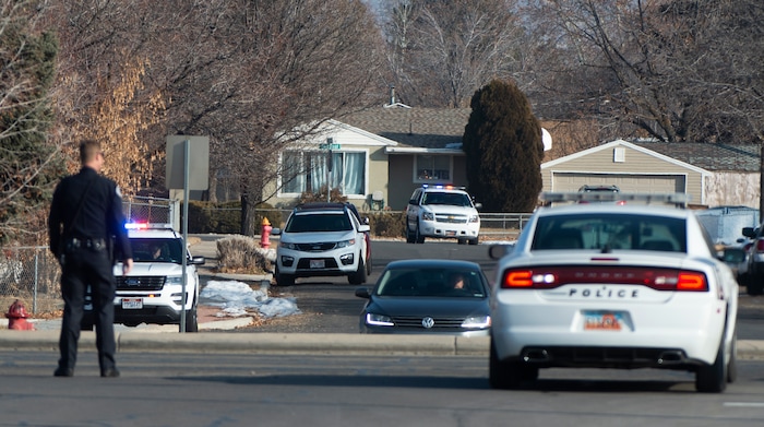 (Rick Egan | The Salt Lake Tribune) Police search the nearby neighborhood, after a shooting at the Fashion Place Mall, in Murray, Sunday, Jan. 13, 2019.