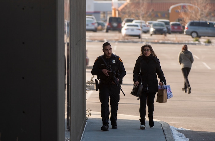 (Rick Egan | The Salt Lake Tribune) A police man escorts a shopper to her car, after a shooting at the Fashion Place Mall in Murray, Sunday, Jan. 13, 2019.