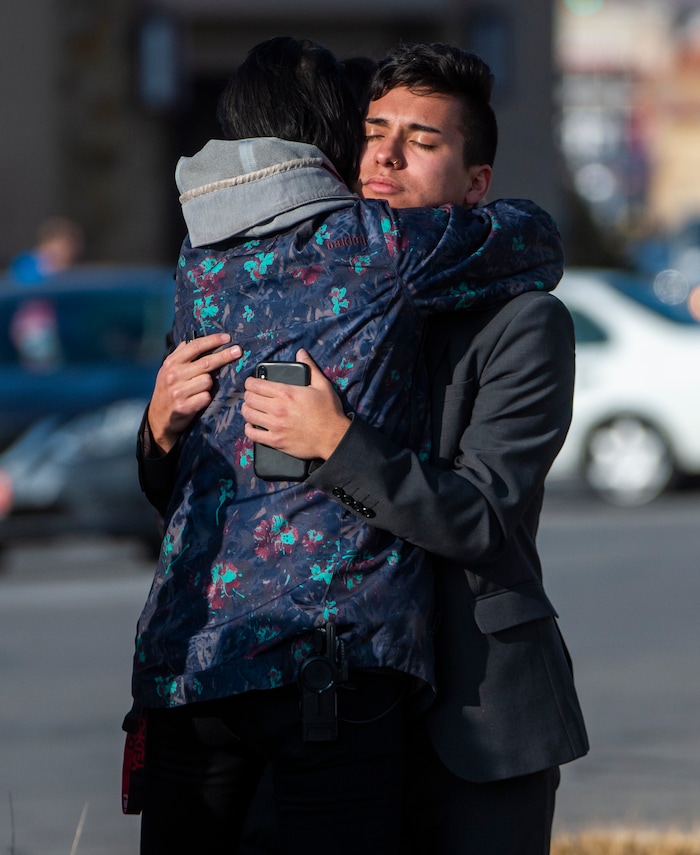 (Rick Egan | The Salt Lake Tribune) Eduardo Platero hugs another employee after the safely escaped the mall shooting, at the Fashion Place Mall, Sunday, Jan. 13, 2019.