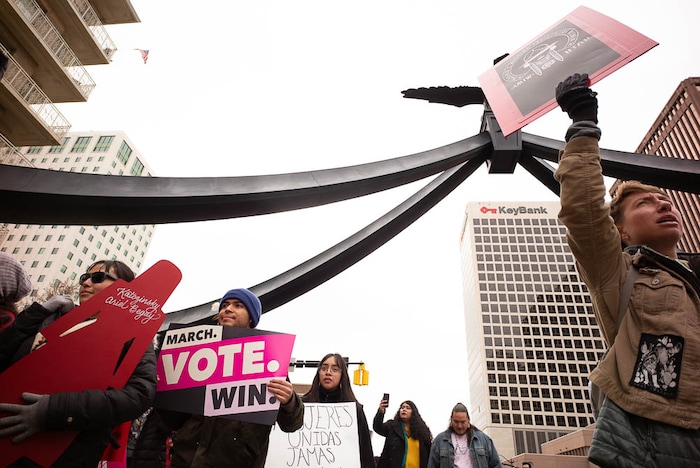 Kristen Jensen, a student at Hillcrest High, acknowledged that as a straight white female she hasn’t felt the discrimination that has hurt many women — but the march is a way to step up and lend her support. “No woman should feel oppressed,” she said.