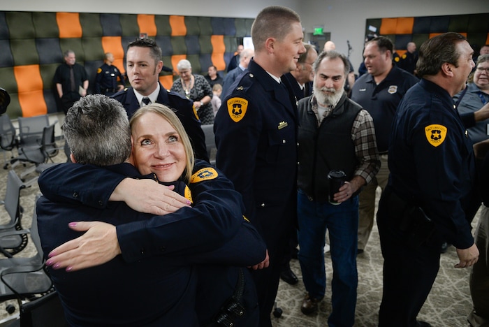 (Francisco Kjolseth | The Salt Lake Tribune) Salt Lake City Airport Police officer Camille Goodwin hugs Deputy Chief Craig Vargo following a ceremony to retire their patch and badge as they are subsumed into the Salt Lake City Police Department on Tuesday, Feb. 26, 2019.