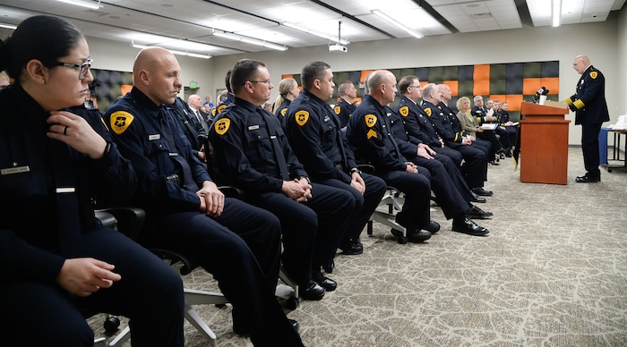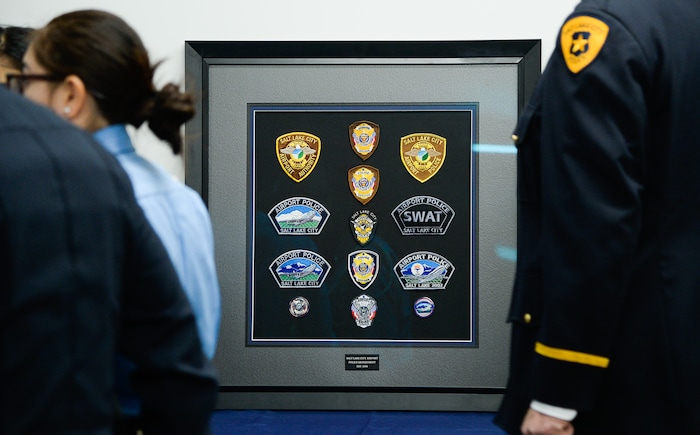 (Francisco Kjolseth | The Salt Lake Tribune) The Salt Lake City Airport Police, established in 1984, is presented with a new patch and badge as they are subsumed into the Salt Lake City Police Department on Tuesday, Feb. 26, 2019.
