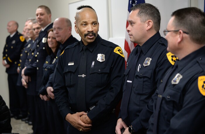 (Francisco Kjolseth | The Salt Lake Tribune) Police Chief Mike Brown addresses members of the airport police, established in 1984, as they gather with friends and family for a ceremony to retire their patch and badge and be pinned with their Salt Lake City Police badges on Tuesday, Feb. 26, 2019.