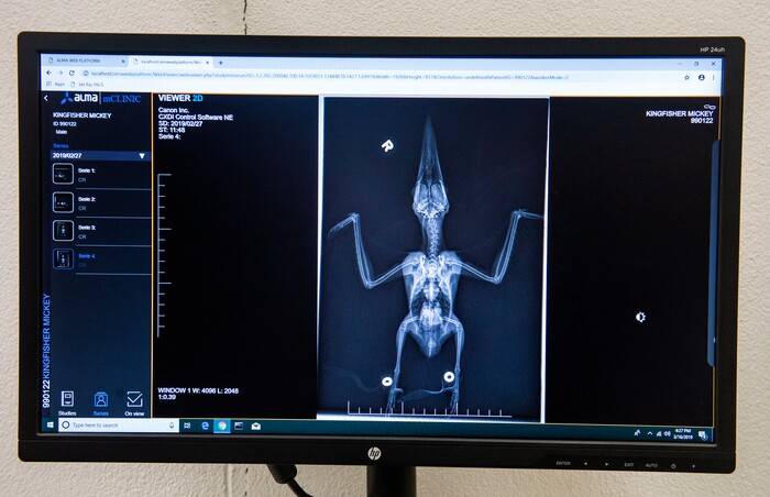 On the screen in the office was an x-ray from a kingfisher bird with its long beak appearing as a sharp white line. In the kitchen was guinea pig food. In the operating room was a dart gun (used sparingly, Kirkessner said).