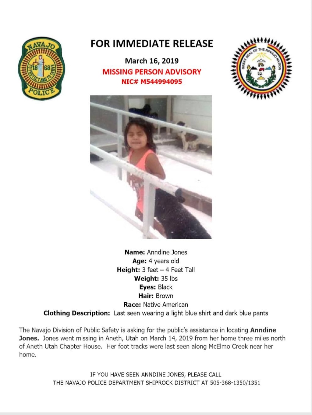 Authorities have temporarily halted efforts to find 4-year-old Anndine Jones in San Juan County after three days of ground and water searches. According to a press release issued Sunday by the Navajo Police Department, the halt “will allow public safety to organize and secure additional resources for subsequent search efforts.”