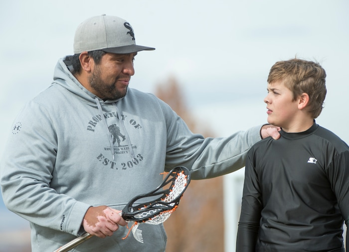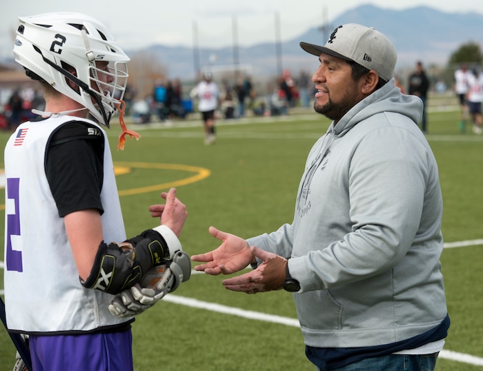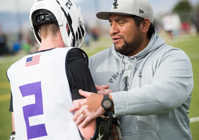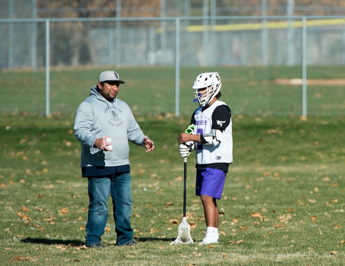 (Rick Egan | The Salt Lake Tribune) Brandyn Gaytan listens to his dad, Box Elder lacrosse coach Juan Gaytan, between games during a tournament in Logan on Saturday, Nov. 3, 2018.