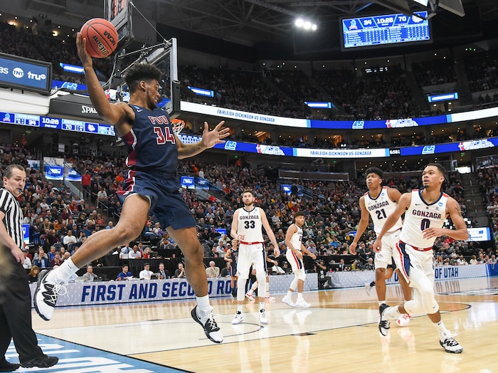 (Francisco Kjolseth | The Salt Lake Tribune) Fairleigh Dickinson Knights forward Mike Holloway Jr. (34) manages to keep the ball in play as Gonzaga faces Fairleigh Dickinson in their first round menÕs NCAA March Madness tournament game at Vivint Smart Home Arena in Salt Lake City on Thursday, March 21, 2019.