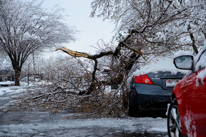 (Francisco Kjolseth | The Salt Lake Tribune) Fernando Sorroche woke up to see his car be a victim of the latest heavy snow fall where multiple tree limbs had snapped in the Sugarhouse area of Salt Lake City on Friday, March 29, 2019.