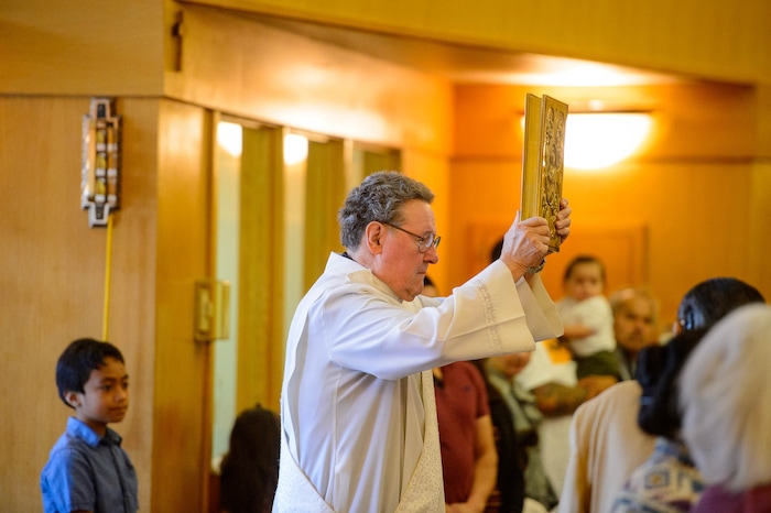 Deacon George Sluga at Easter Mass at Saints Peter & Paul Catholic Church in West Valley City on Sunday April 21, 2019.