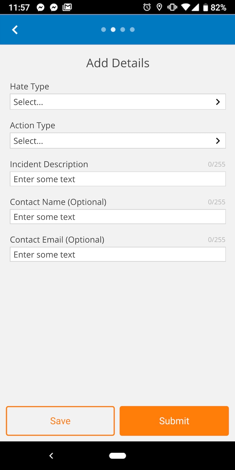 From there, the app asks users to log the location of an incident, followed by the bias motivator (someone’s disability, gender/identity, race/ethnicity, etc.) and what action they witnessed (property damage, verbal threats, propaganda).